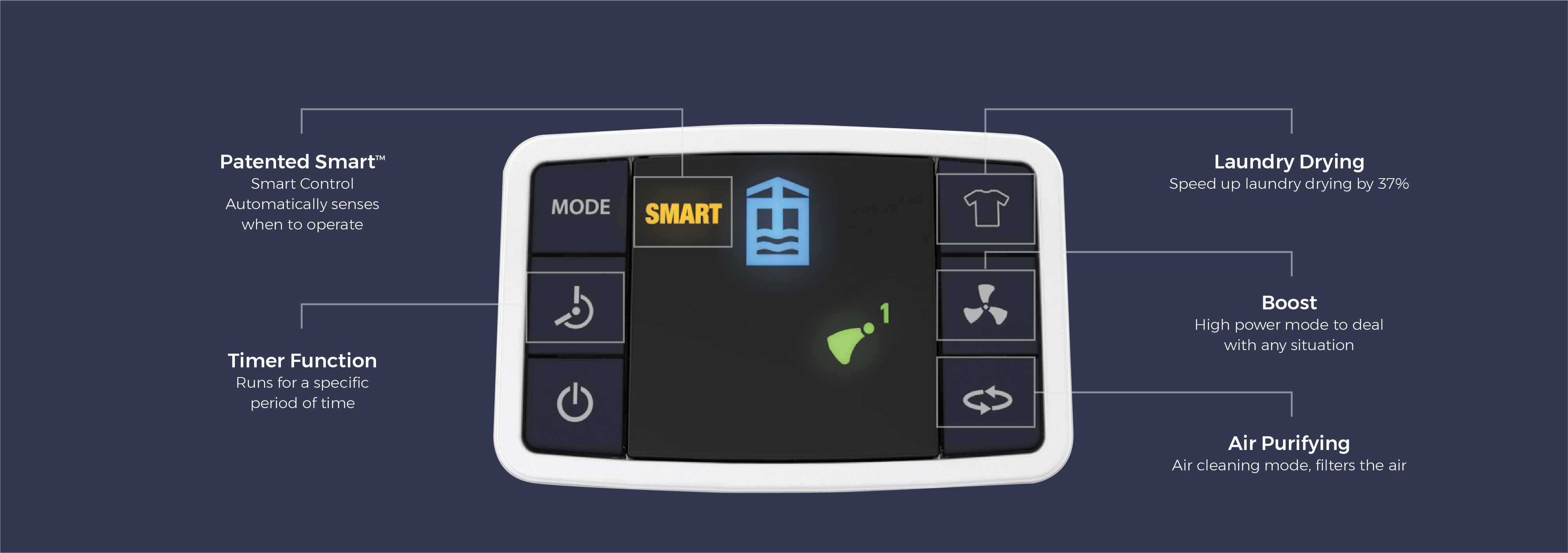 • Adaptive Extraktionsrate: Smart Control Technology passt das Gerät an die unterschiedlichen Bedingungen in Ihrer Wohnung an. Er entzieht der Luft soviel Feuchtigkeit, um eine zu hohe Feuchtigkeit und Kondensation zu verhindern.